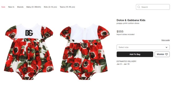 রাহার জামাটি ইটালির পোশাকের ব্র্যান্ড ডলচে অ্যান্ড গাবানার পপি ফ্লাওয়ার সংগ্রহের ছোটদের পোশাক। সাদা সুতির ফ্রকের উপর উজ্জ্বল লাল রঙের পপি ফুলের ছাপ। ফ্রিল দেওয়া ছোট্ট হাতা দু’টি ছাড়া জামার নকশা বলতে উপরের অংশ বা বডিসে হানিকম্ব করা সাদা কাপড়ের উপর কালো সুতোয় আঁকা ব্র্যান্ডের লোগো। ডলচে অ্যান্ড গাবানার ওয়েবসাইটেই দেখা যাচ্ছে পোশাকটির দাম ৫৫৫ আমেরিকান ডলার। ভারতীয় মুদ্রায় যার দাম কম-বেশি ৪৭ হাজার ৫৯৭ টাকা।