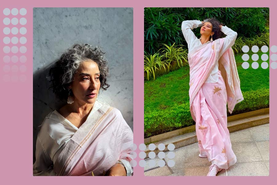 মনীষা পাউডার পিঙ্ক রঙের নরম শাড়িতে যে স্নিগ্ধতা নিয়ে এসেছেন, তা এই গ্রীষ্মে এক গোছা তাজা গোলাপ ফুলের মতোই আরামদায়ক। তাঁর গোলাপি জমির শাড়িতে সোনালি সুতোর সূক্ষ্ম কারুজাজ। অনুজ্জ্বল রুপোলি জরির ইঞ্চি পাড়। আর এই শাড়িকে মনীষা পরেছেন একটি ফুল স্লিভ সাদা শার্টের সঙ্গে। সঙ্গে পায়ে ওই রঙেরই গোলাপি স্নিকার্স! বয়সসুলভ রং না করা কাঁচা-পাকা চুল। অভিনেত্রী বুঝিয়ে দিয়েছেন, নিজস্বতা আর আরামকে দাপটের সঙ্গে বহন করতে হয় কী ভাবে।