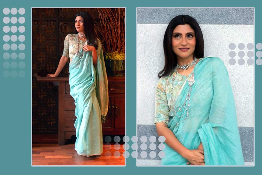 নরম, গায়ে লেপ্টে থাকা একরঙা, পাড়হীন, পাউডার ব্লু লিনেনের শাড়ি পরে কঙ্কনাকে এক গ্লাস তাজা শরবতের মতোই ফ্রেশ দেখাচ্ছে। তার সঙ্গে প্রিন্টেড ব্লাউজ় আর লেয়ার্ড রুপোর নেকলেস পরায় সাজে এক অদ্ভুত ক্লাসিক ভাব এসেছে। ‘মিনিমালিজম’ বা সংক্ষিপ্ততা ছেড়ে বাহুল্য বা ম্যাক্সিমালিজ়মই হালের ট্রেন্ড। কিন্তু কঙ্কনার সাজ দেখিয়ে দিয়েছে, কম সেজেও ভিড়ের মধ্যে আলাদা হওয়া যায় কী করে।