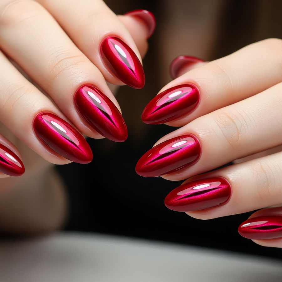 এই নখজসজ্জায় মেটালিক পার্টিক্ল বা ধাতব কণা যুক্ত ‘গ্লিটার’ ভিত্তিক বিশেষ ধরনের নেল পলিশ ব্যবহার করা হয়। প্রাথমিক অবস্থায় দেখতে সাধারণ ঝিকমিক করা নেল পলিশ-ই মনে হবে। তবে চুম্বকের সাহায্যে ধাতব কণিকাগুলোকে যখন বিভিন্ন আকার দিলে বা নখের নানান দিকে ছড়িয়ে দেওয়ার পর আসল সৌন্দর্য ফুটে ওঠে। এই নকশায় নখের উপর একটি রুপালি বা সোনালি শিমার তৈরি হয়, যা বিভিন্ন কোণে আলোর সঙ্গে প্রতিফলিত হয়ে বিড়ালের চোখের মতো চকচকে লাগে। স্মৃতিকণার মতে, এখন গ্লাস, সিল্ক, ওয়াটার বেস্ড, নাইন ডি ক্যাট আইয়ের নকশা বেশ ট্রেন্ডিং।