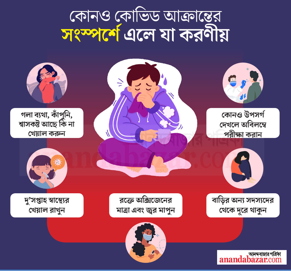 রাজ্যে লকডাউন পরিস্থিতি। বাড়ির বাইরে মানুষ তেমন বেরচ্ছেন না। কিন্তু এর মধ্যেই অজান্তে আমরা অনেকে কোনও না কোনও কোভিড আক্রান্তের কাছাকাছি চলে যাচ্ছি। এবং সংক্রমিত হয়ে পড়ছি। আপনার যদি মনে হয় গত কয়েকদিনের মধ্যে কোনও কোভিড-আক্রান্তের সংস্পর্শে এসেছেন, তা হলে আপনাকেও কয়েকটা নিয়ম মেনে চলতে হবে।
