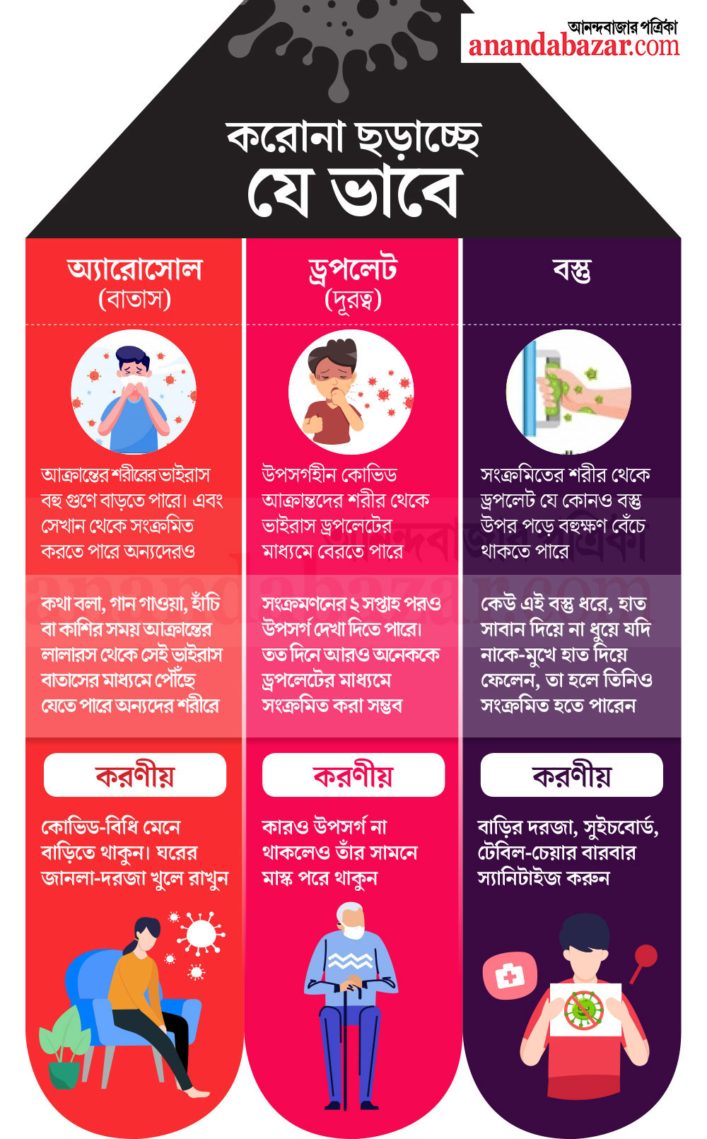 কিন্তু এখন সেই নিময় পাল্টে গিয়েছে। সম্প্রতি কেন্দ্রীয় স্বাস্থ্য মন্ত্রকের নতুন কোভিড-নির্দেশিকা অনুযায়ী ১০ মিটার পর্যন্ত অ্যারোসোল হাওয়ায় ভেসে বেড়াতে পারে। অ্যারোসোল আসলে ড্রপলেটেরই আরও ক্ষুদ্র কণা। আমরা যখন কোনও ডিওড্র্যান্ট ব্যবহার করি, সেই তরলের ক্ষুদ্রতম কণা গ্যাসের আকারে প্রচন্ড প্রেশারে আমাদের গায়ে এসে পড়ে। ঠিক তেমনই কোনও সংক্রমিত ব্যক্তি কথা বললে, গান করলে, হাঁচলে বা কাশলে, তাঁর লালারসের মাধ্যমে ভাইরাস বেরিয়ে আসে। এবং সেই অ্যারোসোল হাওয়ায় প্রায় ১০ মিটার অবধি ভেসে বেড়াতে পারে। তার মধ্যে যদি অন্য কোনও ব্যক্তি থাকেন, তিনিও সংক্রমিত হয়ে পড়তে পারেন।