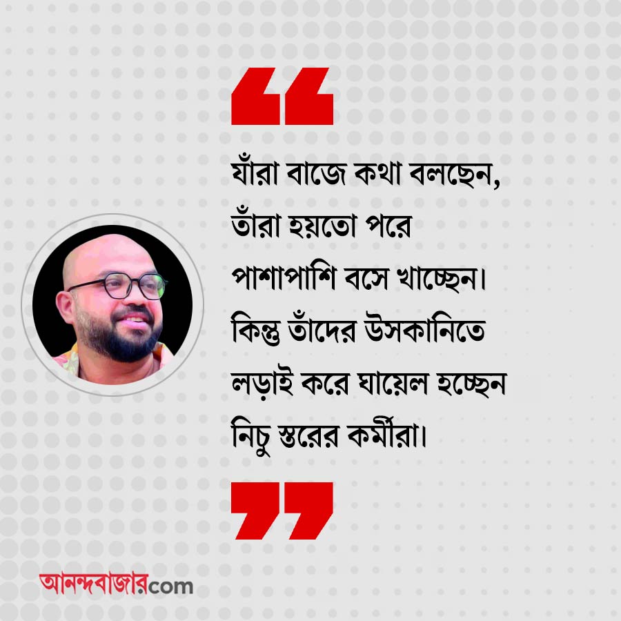 অভিষেক: আসলে রাজায় রাজায় যুদ্ধ হয়, উলুখাগরার প্রাণ যায়! যাঁরা বাজে কথা বলছেন, তাঁরা হয়তো পরে পাশাপাশি বসে খাচ্ছেন। কিন্তু তাঁদের উসকানিতে লড়াই করে ঘায়েল হচ্ছেন নিচু স্তরের কর্মীরা।