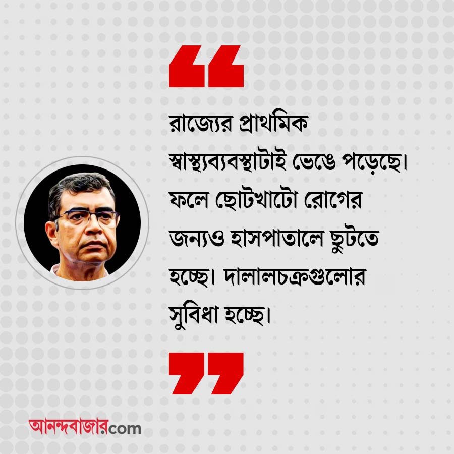 সুবর্ণ: রাজ্যের প্রাথমিক স্বাস্থ্যব্যবস্থাটাই ভেঙে পড়েছে। ফলে ছোটখাটো রোগের জন্যও হাসপাতালে ছুটতে হচ্ছে। দালালচক্রগুলোর সুবিধা হচ্ছে। এ ছাড়়া, রাজনৈতিক আনুগত্য দেখে চিকিৎসাকর্মীদের বদলি বন্ধ হওয়া উচিত। মেডিক্যাল শিক্ষা দুর্নীতিমুক্ত এবং চিকিৎসকের কর্মক্ষেত্রে নিরাপত্তা নিশ্চিত করা উচিত।