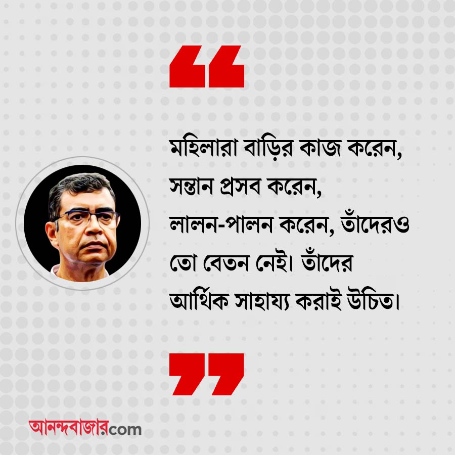 সুবর্ণ: কাজ না দিলে ভাতা দেওয়াটা সরকারের কর্তব্য। কিন্তু সেটা যেন শেষ সমাধান না হয়। আসল সমাধান হবে কর্মসংস্থান। তা ছাড়া, যে মহিলারা বাড়ির কাজ করেন, সন্তান প্রসব করেন, লালন-পালন করেন, তাঁদেরও তো বেতন নেই। তাঁদের আর্থিক সাহায্য করাই উচিত।