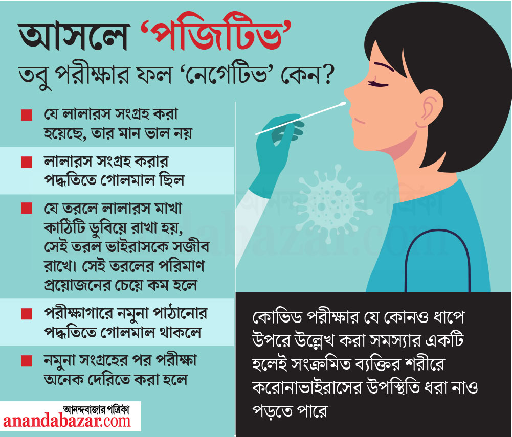 এক সময় অনেকে দাবি করছিলেন, নতুন প্রজাতির করোনাভাইরাসকে আরটি-পিসিআর পরীক্ষা ধরতে পারছে না। কিন্তু হালে সরকারের তরফে বলা হয়েছে, এই দাবি মোটেই ঠিক নয়। ফলে এই মুহূর্তে পরীক্ষা পদ্ধতির সীমাবদ্ধতাকেই ‘ভুল’ ফলের কারণ বলছেন চিকিৎসকেরা।