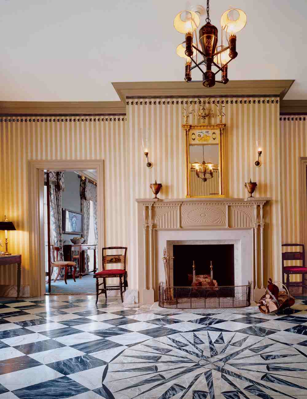 যেমন ১০ হাজার বর্গফুটেরও বেশি এলাকা জুড়ে বিস্তৃত এই দ্বিতল বাড়িতে ঢোকার দরজাটি হলুদ রঙের। সেটি দিয়ে প্রবেশ করলে দেখা যায় চকমেলানো সাদা-কালো ফ্লোরিং। তবে সেটি মার্বেলের নয়। শীতের দেশে কাঠের ফ্লোরিংয়ে ঘর গরম থাকে বেশি। আবার মার্বেলের নকশা দেখতে বেশি ভাল লাগে। তাই এখানে কাঠের মেঝেতেই দেওয়া হয়েছে মার্বেলের ফিনিশ। সাদা কালো দাবার বোর্ডের মতো নকশার পুরোটাই হাতে আঁকা। সে আঁকার নৈপুন্য এতটাই যে অভিজ্ঞ চোখও এক নজরে তফাত করতে পারবে না।
