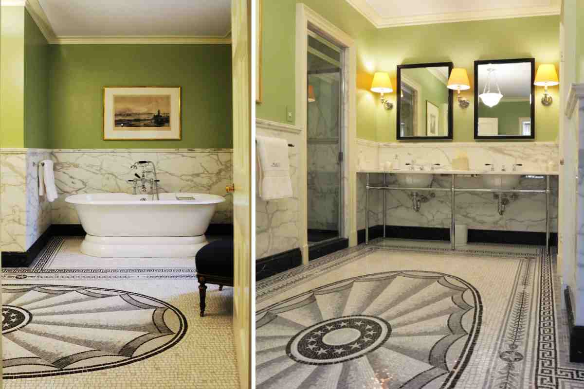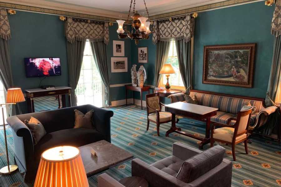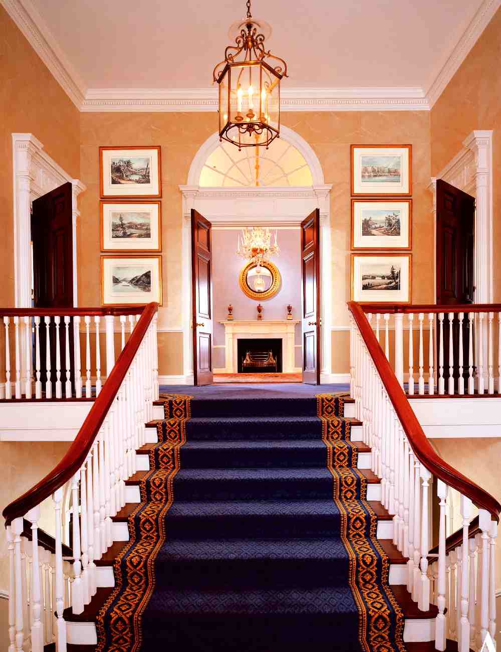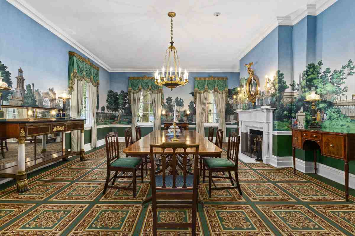লাইব্রেরি পেরিয়ে যেতে হয় খাবার ঘরে। এ ঘরটির দেওয়াল সাজানো ফ্রেঞ্চ ওয়ালপেপারে। আর তাতে আঁকা সবুজ গাছপালা। ১৮০০সালে আঁকা এই ওয়ালপেপারের ছবি এতটাই প্রাণবন্ত যে এ ঘরে ঢুকলে হঠাৎ মনে হতে পারে বাগানেই এসে পড়েছেন। ঠিক মাঝখানে কাঠের বড় টেবিল। দশ জনের খাওয়ার জায়গা। মেঝের কার্পেটও ঘাসের মতোই সবুজ। তবে তাতে রয়েছে ফরাসি ধাঁচের কলকার নকশা।