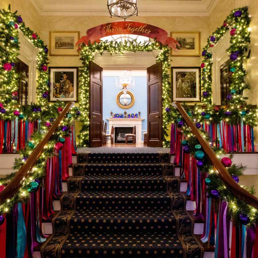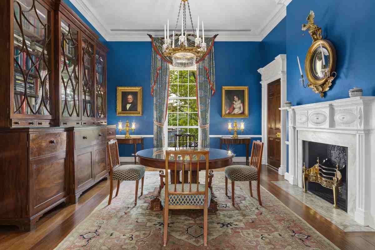এটি গ্রেসি ম্যানসনের এন্ট্রেন্স লবি। এর পাশেই রয়েছে গ্রেসি ম্যানশনের গ্রন্থাগার। যার আপাদমস্তক ‘টিল ব্লু’ রঙে মোড়া। খানিকটা কালচে সমুদ্র নীল বললে রংটা বোঝা যায়। এ ঘরের দেওয়াল থেকে শুরু করে ফ্লোরিং সোফা এমনকি পর্দাতেও সেই রং। তার সঙ্গে রয়েছে মেহগনি রঙের বইয়ের আলমারি।