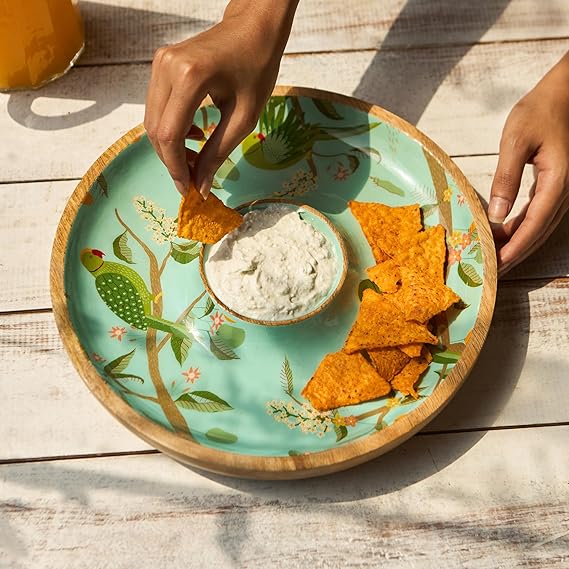 সস্ দিয়ে কোনও খাবার পরিবেশন করতে হলে বেছে নিতে পারেন এমন ট্রে। এই ধরনের ট্রেতে ফুল বা পাখি-সহ বিভিন্ন নকশা থাকে। ট্রের মধ্য ভাগে কাঠেরই বাটির মতো অংশ থাকে সস্ বা ডিপ দেওয়ার জন্য। চিপ্‌স, নাচোস, ফ্রেঞ্চ ফ্রাই, গোল্ডেন প্রন ফ্রাই, পকোড়া— এমন ধরনের স্ন্যাক্স সাজিয়ে মাঝে বাটির অংশে সস্ দিয়ে পরিবেশন করুন।