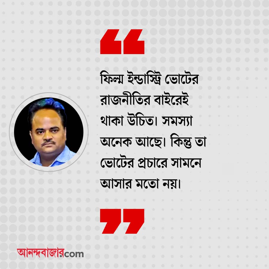 সোমনাথ: আমি মনে করি ফিল্ম ইন্ডাস্ট্রি ভোটের রাজনীতির বাইরেই থাকা উচিত। সমস্যা অনেক আছে। কিন্তু তা ভোটের প্রচারে সামনে আসার মতো নয়।