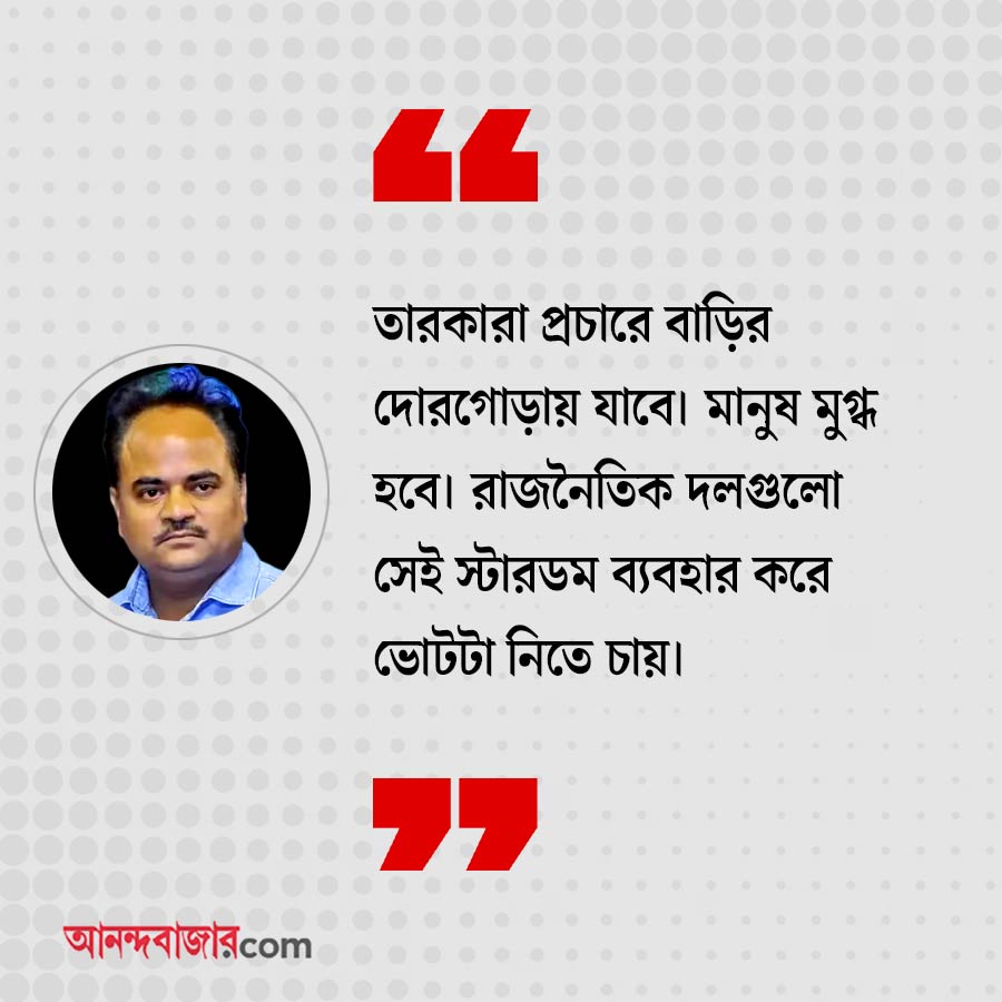 সোমনাথ: রাজনৈতিক দল তারকাদের দিয়ে মানুষের মন ভোলায়। তারকারা প্রচারে বাড়ির দোরগোড়ায় যাবে। মানুষ মুগ্ধ হবে। রাজনৈতিক দলগুলো সেই স্টারডম ব্যবহার করে ভোটটা নিতে চায়।