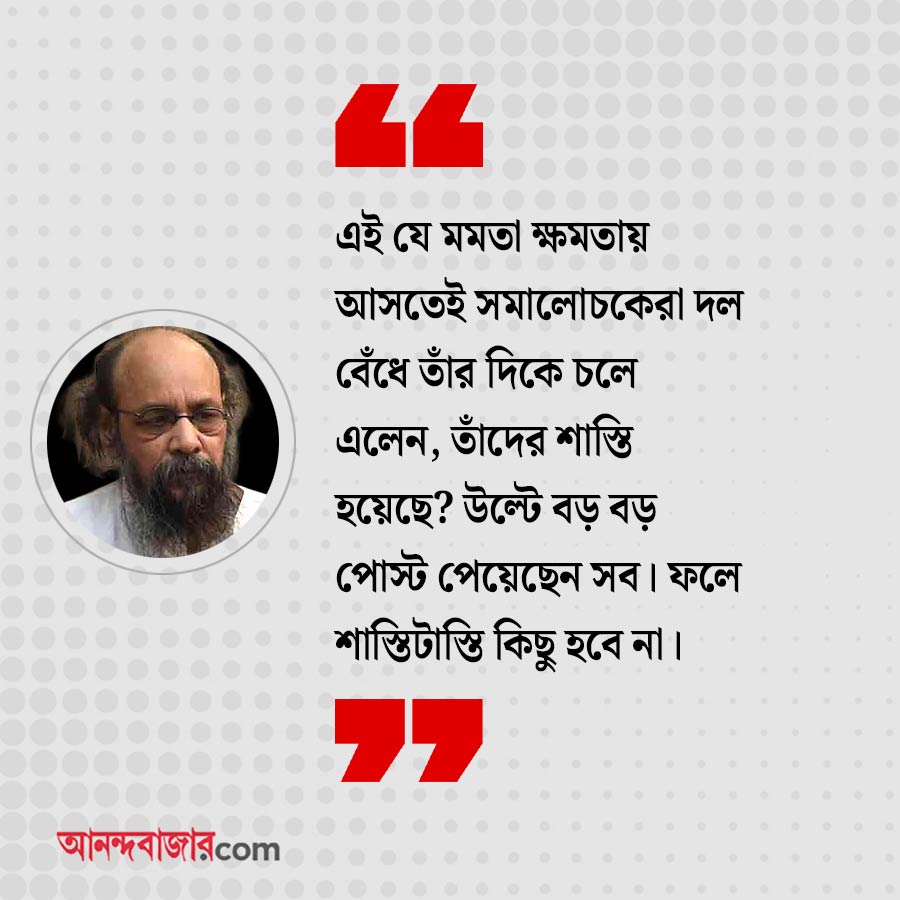 জয়: এই যে মমতা ক্ষমতায় আসতেই সমালোচকেরা দল বেঁধে তাঁর দিকে চলে এলেন, তাঁদের শাস্তি হয়েছে? উল্টে বড় বড় পোস্ট পেয়েছেন সব। ফলে শাস্তিটাস্তি কিছু হবে না। এঁরাই আবার যদি নতুন কেউ আসে, তার দিকে যাবে। মোট কথা ক্ষমতা যেখানে, মানুষ সেখানেই।