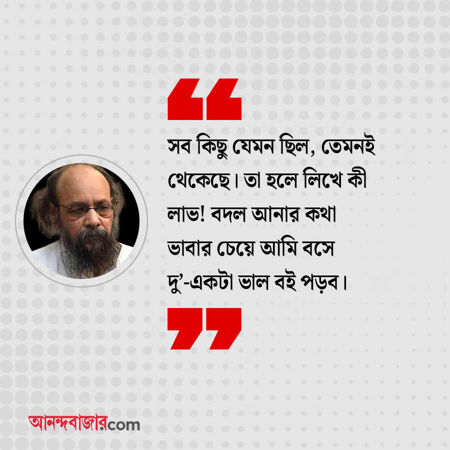 জয়: সমাজ বদলানো যাবে, আগে ভাবতাম। ভাবতাম লিখে মানুষকে ভাবানো যায়। ভুল ভাবতাম। বরং লিখে বিদ্রুপের পাত্র হয়েছি। সব কিছু যেমন ছিল, তেমনই থেকেছে। লিখে কী লাভ! বদল আনার কথা ভাবার চেয়ে আমি বসে দু’-একটা ভাল বই পড়ব।