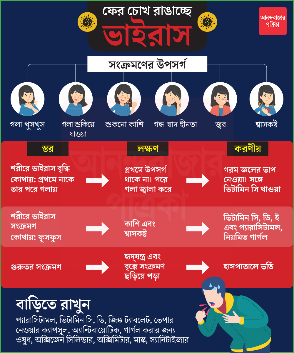 জেনে রাখা জরুরি, কোন উপসর্গ দেখা দেওয়া মানে কতটা গুরুতর হয়েছে সংক্রমণ। যেমন করোনা সংক্রমণের তিনটি মূল স্তর রয়েছে। প্রথম স্তরে ভাইরাস থাকে নাক-গলায়। এই স্তরে বিশেষ জ্বর বা বড় কোনও অসুবিধা দেখা দেয় না। সংক্রমণ গলা পর্যন্ত গেলে, কারও কারও গলা জ্বালা করে। এমন উপসর্গ দেখা দিলে ভিটামিন-সি খেতে শুরু করে দেওয়া জরুরি।