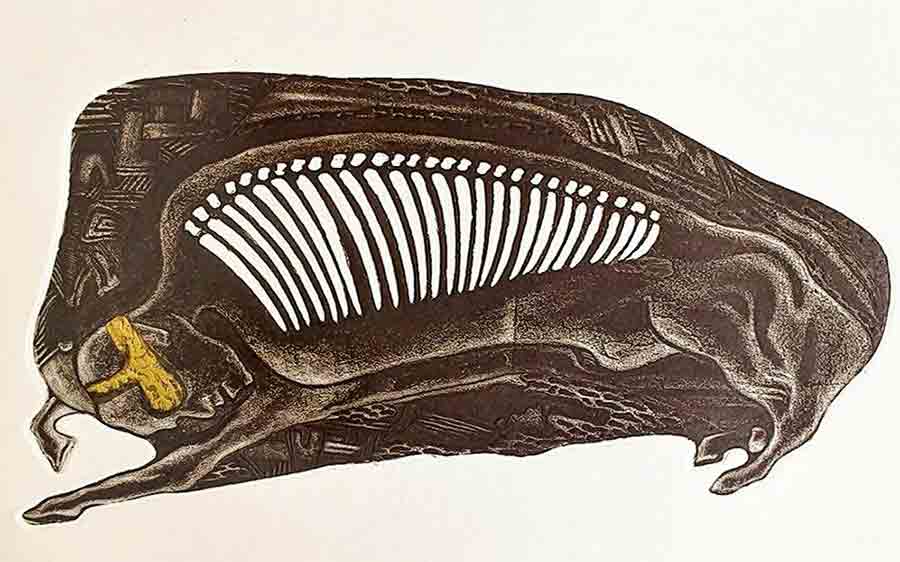 পলা সেনগুপ্তের ‘দা গ্ৰিন জ়েব্রাস’ এচিং এবং অ্যাকোয়াটিন্টে ভারী সুন্দর কাজ। শুধুমাত্র রেখার সাহায্যেই নয়, বিস্তৃত এলাকায় রঙের টোন দিয়ে যেন কিছুটা জলরঙের ওয়াশের মেজাজে দু’টি জ়েব্রার মিলনের পূর্বরাগ দেখিয়েছেন।
