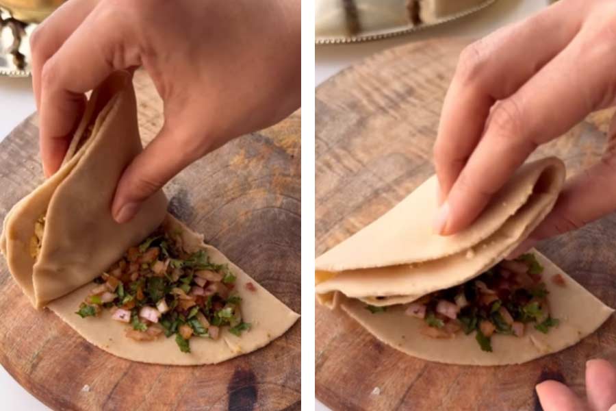 এ বার কাটা অংশ থেকে ভাঁজ শুরু করুন। প্রথম ধাপে আলুর পুর ঢাকবে। দ্বিতীয় ধাপে ঢাকা পড়বে পেঁয়াজ, তার পর পনির ও সব শেষে চিজ়। তিনকোনা পরোটার মতো দেখতে হবে। এ বার সেই পরোটাটি হালকা হাতে বেলে নিতে হবে।
