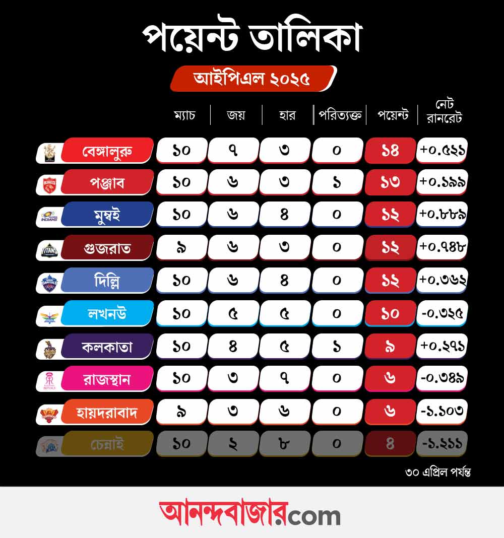 বেঙ্গালুরু (১৪) এবং পঞ্জাব (১৩) ইতিমধ্যেই ১২-র বেশি পয়েন্ট পেয়েছে। ফলে এই দু’টি দলকে আর পেরোতে পারবে না চেন্নাই। এখনকার পয়েন্ট তালিকা অনুযায়ী, মুম্বই, গুজরাত এবং দিল্লির ১২ পয়েন্ট করে রয়েছে।