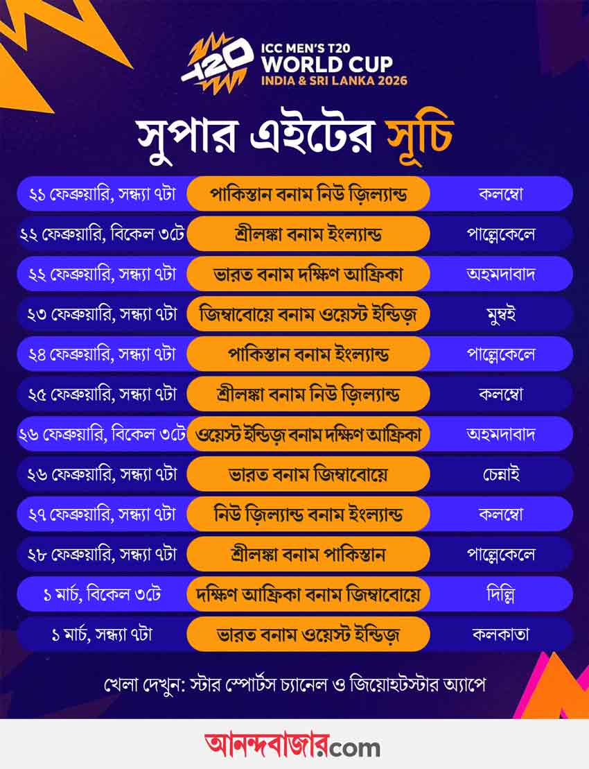 সুপার এইটে ভারতের দ্বিতীয় ম্যাচ ২৬ ফেব্রুয়ারি বৃহস্পতিবার। ভারতকে খেলতে হবে জিম্বাবোয়ের সঙ্গে। এই ম্যাচ সন্ধ্যা ৭টা থেকে। ওই দিনই বিকেল ৩টেয় মুখোমুখি ওয়েস্ট ইন্ডিজ় এবং দক্ষিণ আফ্রিকা। ২৭ ও ২৮ ফেব্রুয়ারি যথাক্রমে ইংল্যান্ড-নিউ জ়িল্যান্ড এবং শ্রীলঙ্কা-পাকিস্তান ম্যাচ। এই দু’টি ম্যাচ সন্ধ্যা ৭টায়।