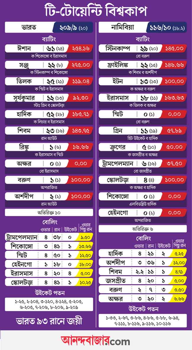 প্রত্যাশা মতোই নামিবিয়ার বিরুদ্ধে জয় পেল ভারত। তবে টি-টোয়েন্টি বিশ্বকাপে পাকিস্তানের মুখোমুখি হওয়ার আগে ব্যাটিং নিয়ে উদ্বেগ পুরোপুরি কাটল না। দিল্লির ২২ গজে প্রথমে ব্যাট করে সূর্যকুমার যাদবেরা করেন ৯ উইকেটে ২০৯ রান। জবাবে নামিবিয়ার ইনিংস শেষ হল ১৮.২ ওভারে ১১৬ রানে। বিশ্বকাপের দ্বিতীয় ম্যাচে ভারত জিতল ৯৩ রানে।