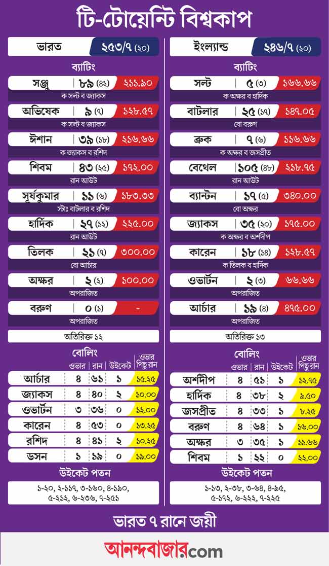 ১২ রান করা সঞ্জু স্যামসনের সহজ ক্যাচ ফেলে ভারতকে ইতিহাস গড়ার মঞ্চ সাজিয়ে দিলেন ইংল্যান্ড অধিনায়ক হ্যারি ব্রুক! তারও আগে আর একটি ভুল করেন তিনি। টস জিতে সকলকে অবাক করে প্রথমে বল করার সিদ্ধান্ত নেন ব্রুক! জ্যাকব বেথেলের শতরানও ইংল্যান্ডকে জেতাতে পারল না। তাঁর ১০৫ রানের ইনিংসের সুবাদে ক্রিকেটপ্রেমীদের অবশ্য উপভোগ্য ক্রিকেট উপহার দিল ইংল্যান্ড। ভারতের ৭ উইকেটে ২৫৩ রানের জবাবে ইংল্যান্ড করল ৭ উইকেটে ২৪৬ রান।
