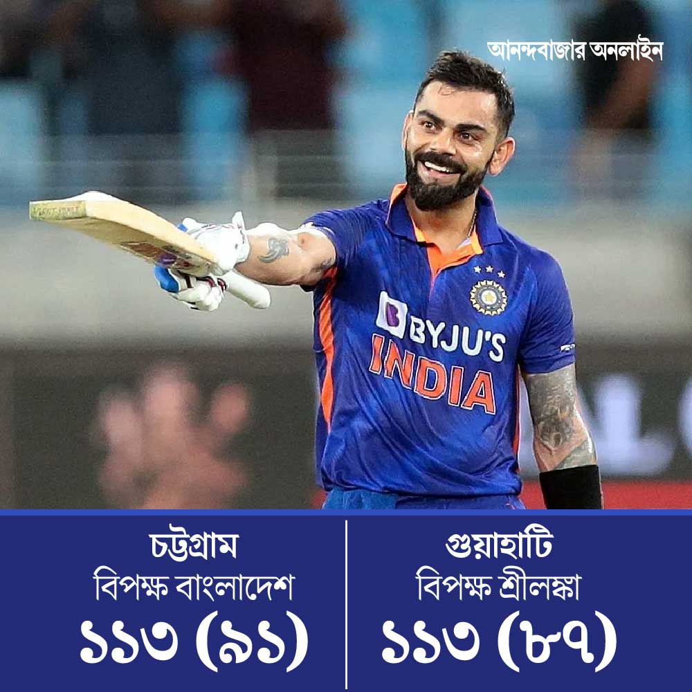 বুধবার ৮৭ বলে ১১৩ রান করেন বিরাট। তাঁর ইনিংস সাজানো ছিল ১২টি চার একটি ছক্কা দিয়ে। বিরাটের স্ট্রাইক রেট ১২৯.৮৮। বিরাট ছাড়াও এই ম্যাচে রান পেয়েছেন রোহিত শর্মা (৮৩) এবং শুভমন গিল (৭০)। লোকেশ রাহুল ২৯ বলে ৩৯ রান করে সাজঘরে ফেরেন। তাঁদের দাপটে ভারত ৩৭৩ রান তোলে। জয়ের জন্য শ্রীলঙ্কার প্রয়োজন ৩৭৪ রান।