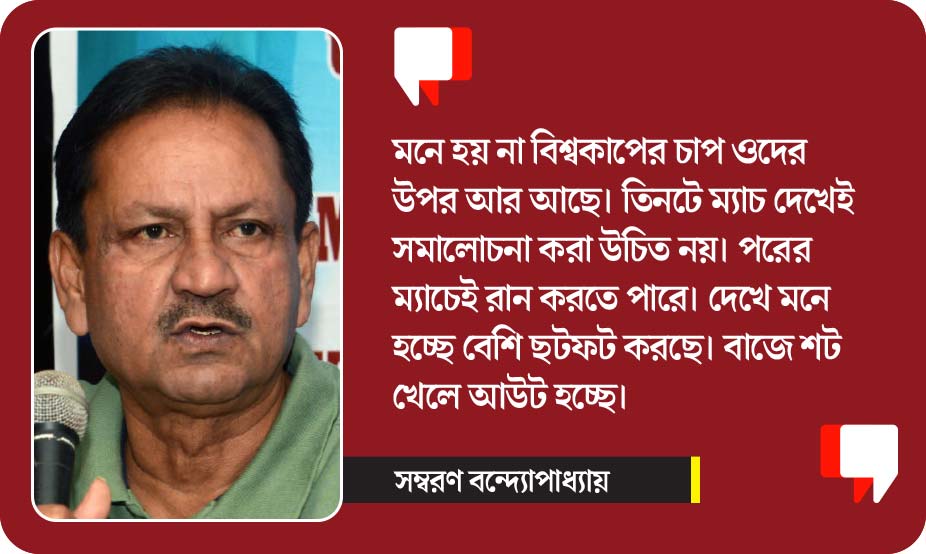 দেশের মাঠে বিশ্বকাপের মতো ‘বড়’ প্রতিযোগিতার চাপ কি নিতে পারছেন না তাঁরা? বাংলার প্রাক্তন ক্রিকেটার সম্বরণ বন্দ্যোপাধ্যায় তা মনে করছেন না। তাঁর কথায়, “আমার মনে হয় না বিশ্বকাপের চাপ ওদের উপর আর আছে। এত বছর ধরে খেলছে! তবে তিনটে ম্যাচ দেখেই সমালোচনা করা উচিত নয়। পরের ম্যাচেই ওরা রান করতে পারে। আমি অন্তত আশাবাদী।”