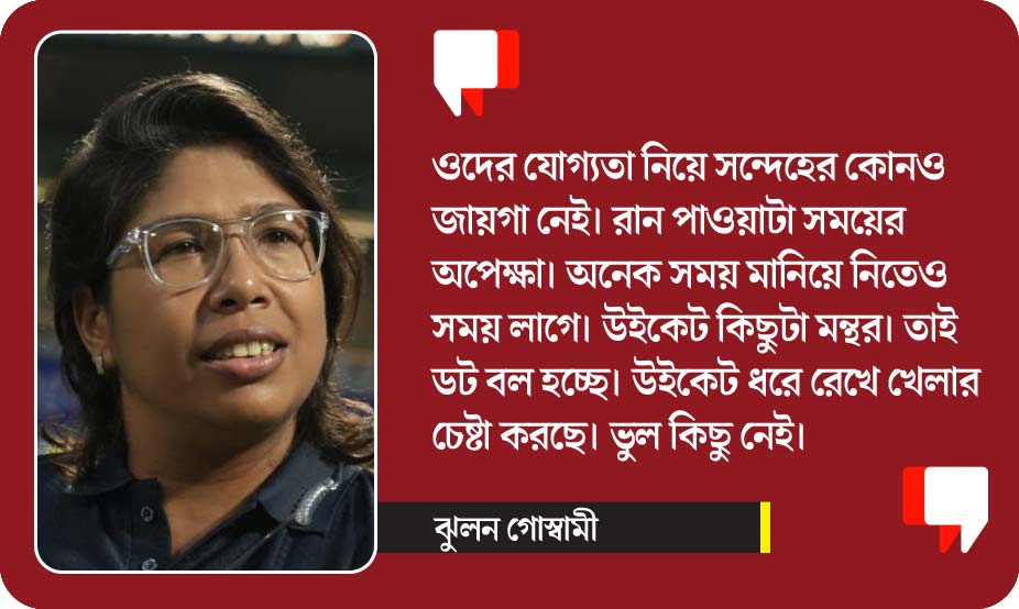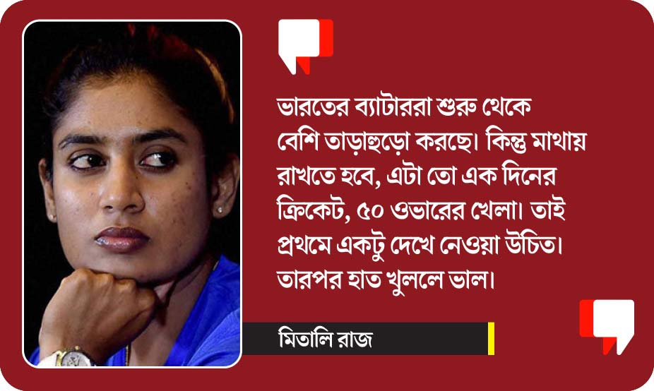 ঘটনাচক্রে, টপ অর্ডারের লাগাতার ব্যর্থতা বিশ্বকাপের সম্প্রচারকারী চ্যানেলে ভারতীয় মহিলা ক্রিকেট দলের প্রাক্তন অধিনায়ক মিতালি রাজ যা বলেছেন, তার সঙ্গে মিল আছে অনুষ্টুপের বক্তব্যের। মিতালির ব্যাখ্যা, ‘‘ওরা তাড়াহুড়ো করছে। এটা ৫০ ওভারের খেলা। একটু দেখে নিয়ে হাত খুললে ভাল।’’ তিন ব্যাটারের রান পাওয়া নিয়ে ‘আশাবাদী’ সম্বরণও মনে করছেন, তাড়াহুড়ো করছেন মন্ধানারা। সেটাই সমস্যায় ফেলছে। তাঁর কথায়, “ওদের দেখে মনে হচ্ছে বেশি ছটফট করছে। সময় নিচ্ছে না। বাজে শট খেলে আউট হচ্ছে। এত ছটফট করলে হবে না।”