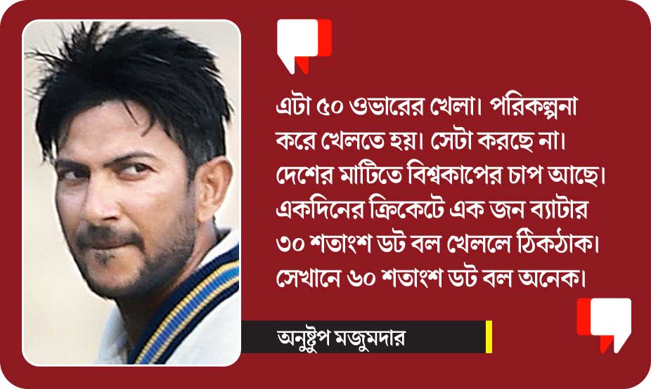 বাংলার ক্রিকেটার অনুষ্টুপ মজুমদার মনে করছেন, তিন ব্যাটারই শুরু থেকে অতিরিক্ত আক্রমণাত্মক খেলতে যাচ্ছেন। তাঁর কথায়, ‘‘এটা টি-টোয়েন্টি নয়। ৫০ ওভারের খেলা। ফিল্ডার কোথায় আছে, কোন বোলারকে মারব, কাকে দেখে খেলব— এসব মাথায় রেখে পরিকল্পনা করে খেলতে হয়। সেটা ওরা করছে না বলেই মনে হচ্ছে। দেশের মাটিতে বিশ্বকাপের চাপ আছে বলেও মনে হচ্ছে।’’ বাংলার অভিজ্ঞ ক্রিকেটারের মূল্যায়ন, ‘‘একদিনের ক্রিকেটে এক জন ব্যাটার ইনিংসে ৩০ শতাংশ ডট বল খেললে সেটা ঠিকঠাক বলে ধরা হয়। সেখানে ভারত ইনিংসে ৬০ শতাংশ ডট বল খেলছে। এটা অনেক। এক ফলে নিজেরাই নিজেদের চাপে ফেলে দিচ্ছে।’’