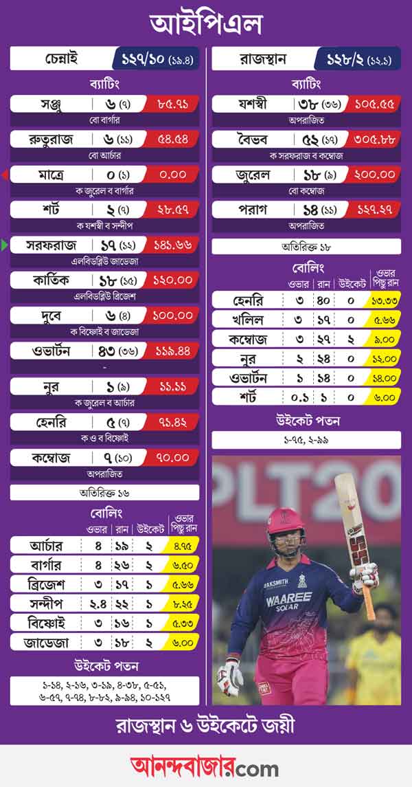 সহজ লক্ষ্যে সহজে পৌঁছে গেল রাজস্থান রয়্যালস। যশস্বী জয়সওয়াল এবং বৈভব সূর্যবংশীর দাপটে চেন্নাই সুপার কিংসের দেওয়া ১২৮ রানের লক্ষ্যে পৌঁছোতে রাজস্থানের সময় লাগল ১২.১ ওভার। একপেশে লড়াই ৮ উইকেটে জিতে আইপিএল শুরু করল রাজস্থান। চেন্নাইয়ের ১৯.৪ ওভারে ১২৭ রানের জবাবে ৪৭ বল বাকি থাকতে রাজস্থান করল ২ উইকেটে ১২৮।