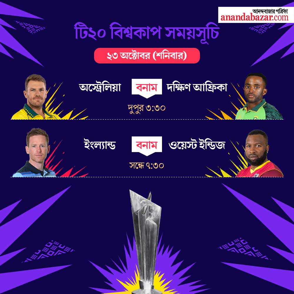শনিবার দ্বিতীয় ম্যাচে মুখোমুখি ওয়েস্ট ইন্ডিজ এবং ইংল্যান্ড। শেষ টি২০ বিশ্বকাপ জিতেছিল ক্যারিবিয়ানরা (২০১৬)। দু’বছর আগে এক দিনের ক্রিকেটে বিশ্বকাপ জেতে ইংল্যান্ড। সাদা বলের ক্রিকেটে দুই শক্তিশালী দল খেলতে নামবে সন্ধে সাড়ে সাতটার সময়। দুবাইতে হবে সেই ম্যাচ।
