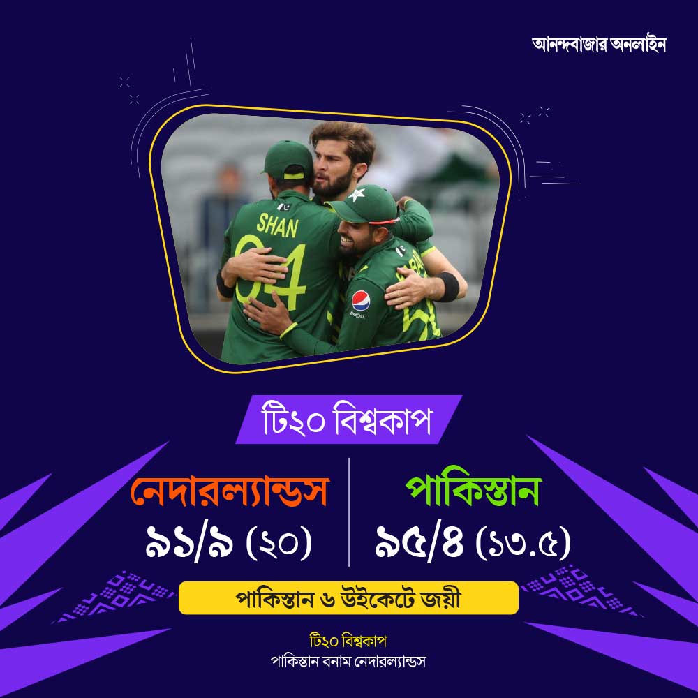 টসে জিতে আগে ব্যাট করার সিদ্ধান্ত নেন নেদারল্যান্ডসের অধিনায়ক স্কট এডওয়ার্ডস। সেই সিদ্ধান্ত ব্যুমেরাং হয়ে যায়। পাকিস্তানের বোলারদের সামনে দাঁড়াতেই পারেননি নেদারল্যান্ডসের কোনও ব্যাটার। গোটা ইনিংসে দু’অঙ্কের রান করেন মাত্র দু’জন ব্যাটার। কলিন অ্যাকারম্যান ২৭ বলে ২৭ করেন। অধিনায়ক এডওয়ার্ডস ১৫ রান করেন। পাকিস্তানের হয়ে শাদাব খান ৩টি উইকেট নিয়েছেন। ২টি উইকেট মহম্মদ ওয়াসিমের। একটি করে উইকেট শাহিন আফ্রিদি, নাসিম শাহ এবং হ্যারিস রউফের।