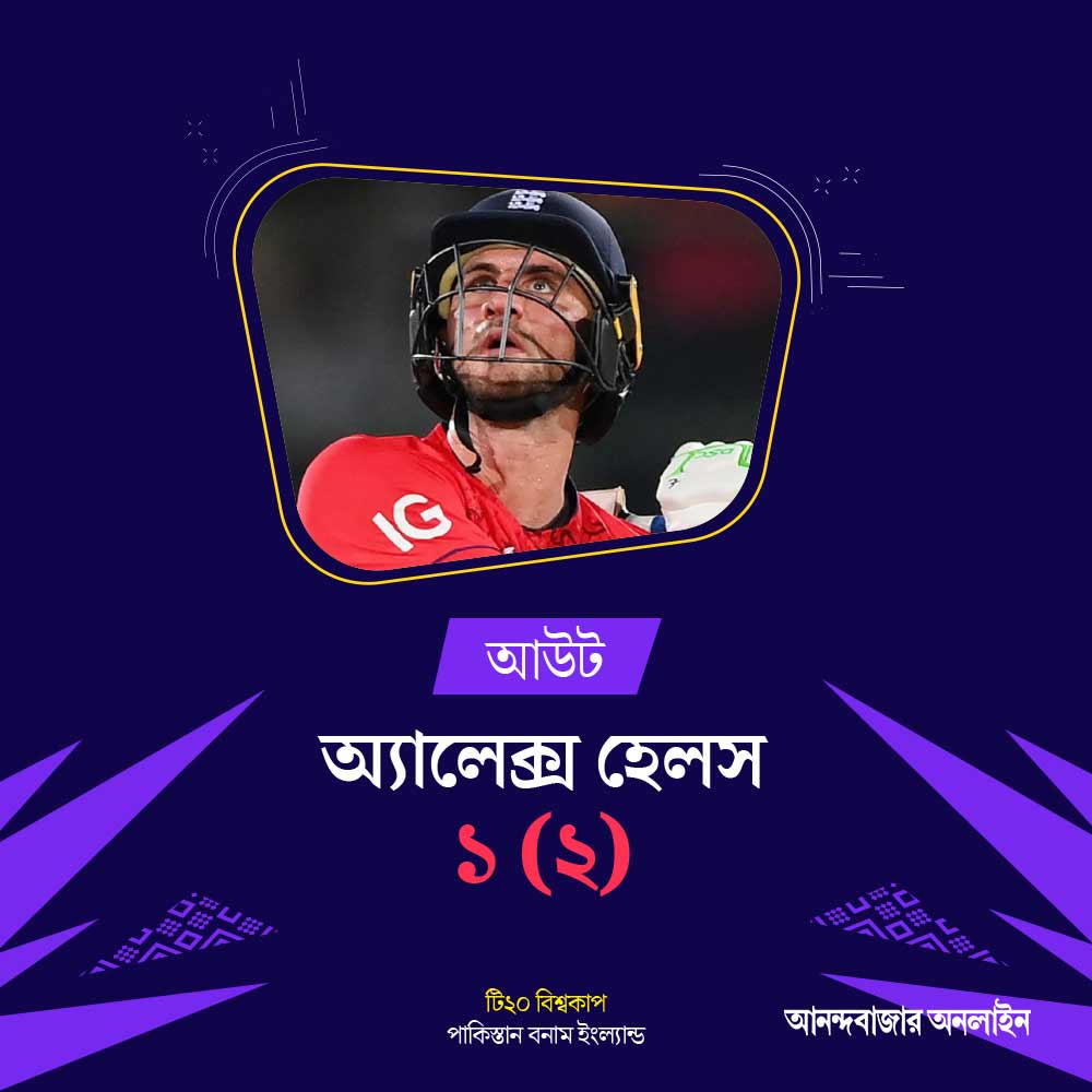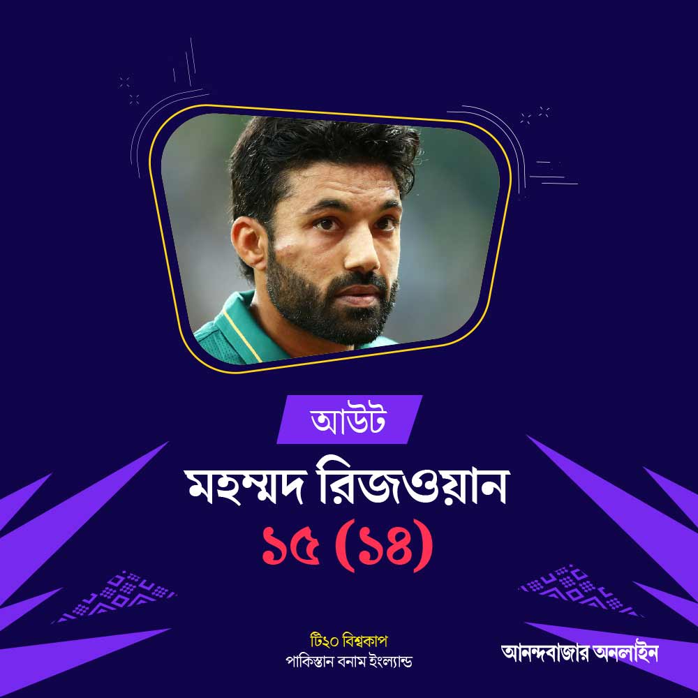 ১৪ বলে ১৫ রান করে স্যাম কারেনের বলে আউট মহম্মদ রিজ়ওয়ান।