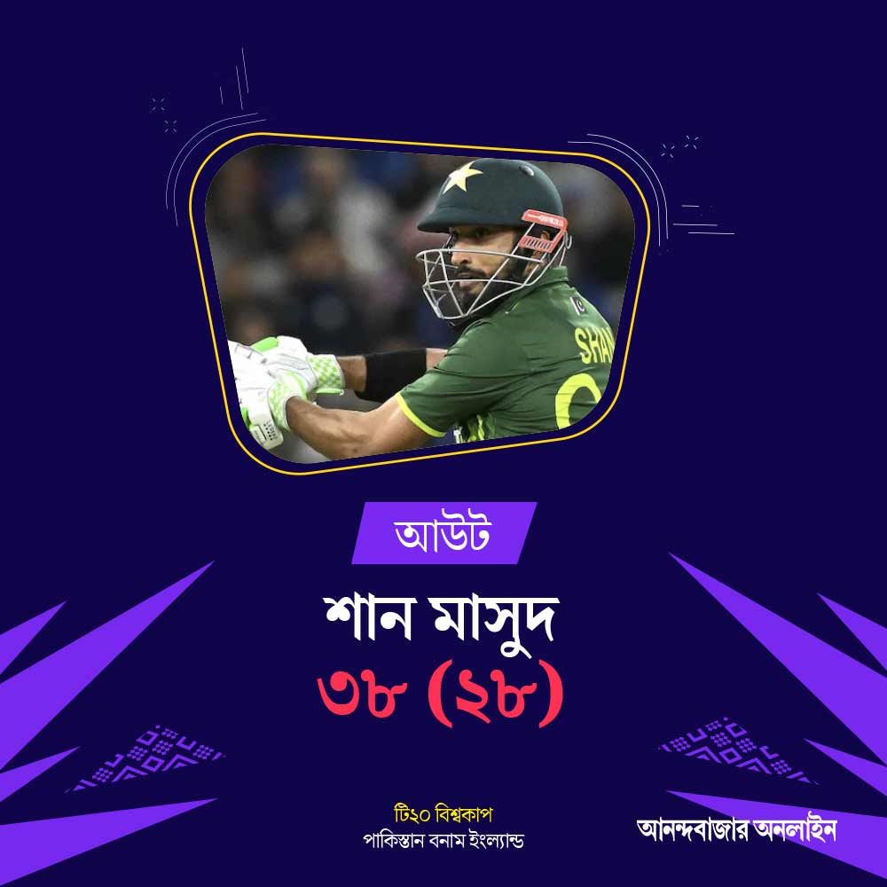 ২৮ বলে ৩৮ রান করে স্যাম কারেনের বলে আউট শান মাসুদ।