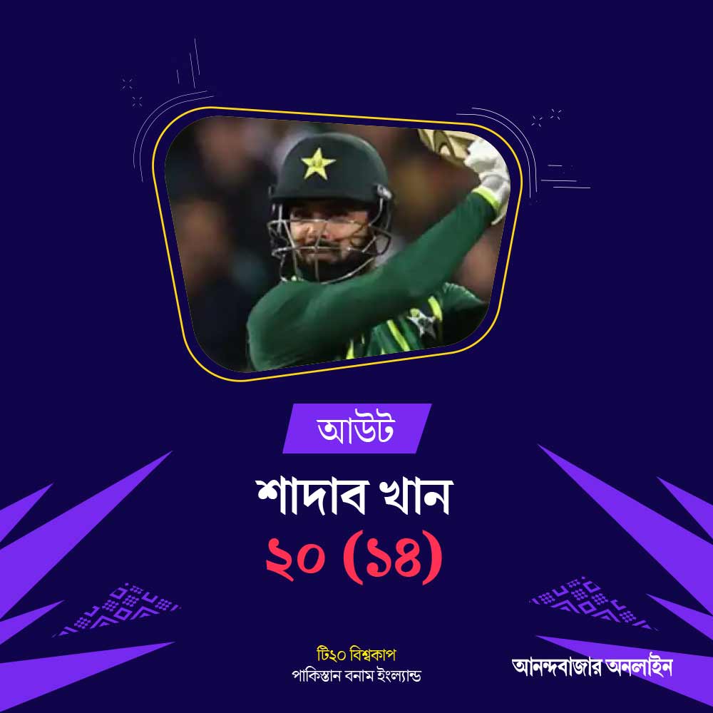 ১৪ বলে ২০ রান করে আউট শাদাব খান।