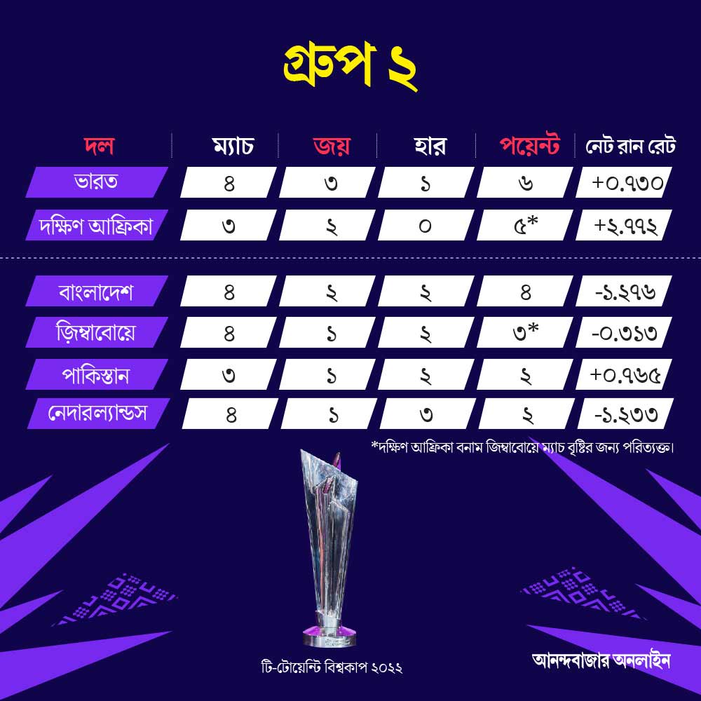 সিডনিতে বৃহস্পতিবার দক্ষিণ আফ্রিকা জিতলেই সেমিফাইনালে যাওয়ার রাস্তা পাকা হয়ে যাবে। ৭ পয়েন্ট পেয়ে যাবেন বাভুমারা। গ্রুপ সেরাও হতে পারেন তাঁরা। কিন্তু বাভুমারা জিতে যাওয়া মানে গ্রুপ ২ থেকে বিদায় নেবে পাকিস্তান। কারণ বাবরদের পক্ষে আর ৬ পয়েন্টে পৌঁছনো সম্ভব হবে না। সে ক্ষেত্রে সুবিধা হবে ভারতের। সেমিফাইনালে যাওয়ার লড়াইয়ে পাকিস্তান ছিটকে গেলেই লাভ ভারতের।