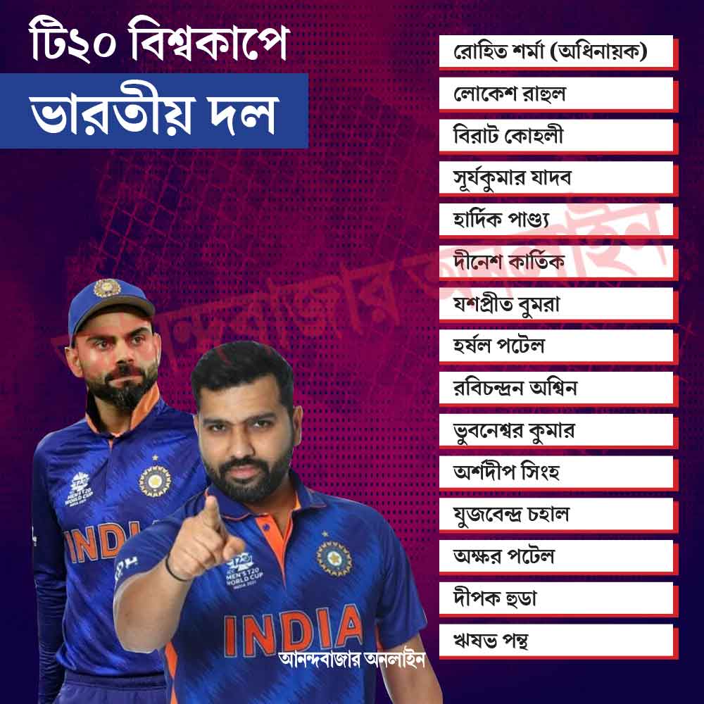 রবীন্দ্র জাডেজার চোট রয়েছে। তাঁকে পাওয়া যাবে না টি-টোয়েন্টি বিশ্বকাপে। অলরাউন্ডার হিসাবে দলে নেওয়া হয়েছে দীপক হুডা, হার্দিক পাণ্ড্য, রবিচন্দ্রন অশ্বিন, এবং অক্ষর পটেলকে। চোট সারিয়ে দলে ফিরেছেন যশপ্রীত বুমরা এবং হর্ষল পটেল। তাঁদের সঙ্গে পেসার হিসাবে থাকছেন ভুবনেশ্বর কুমার এবং অর্শদীপ সিংহ। বাদ দেওয়া হয়েছে আবেশ খানকে।