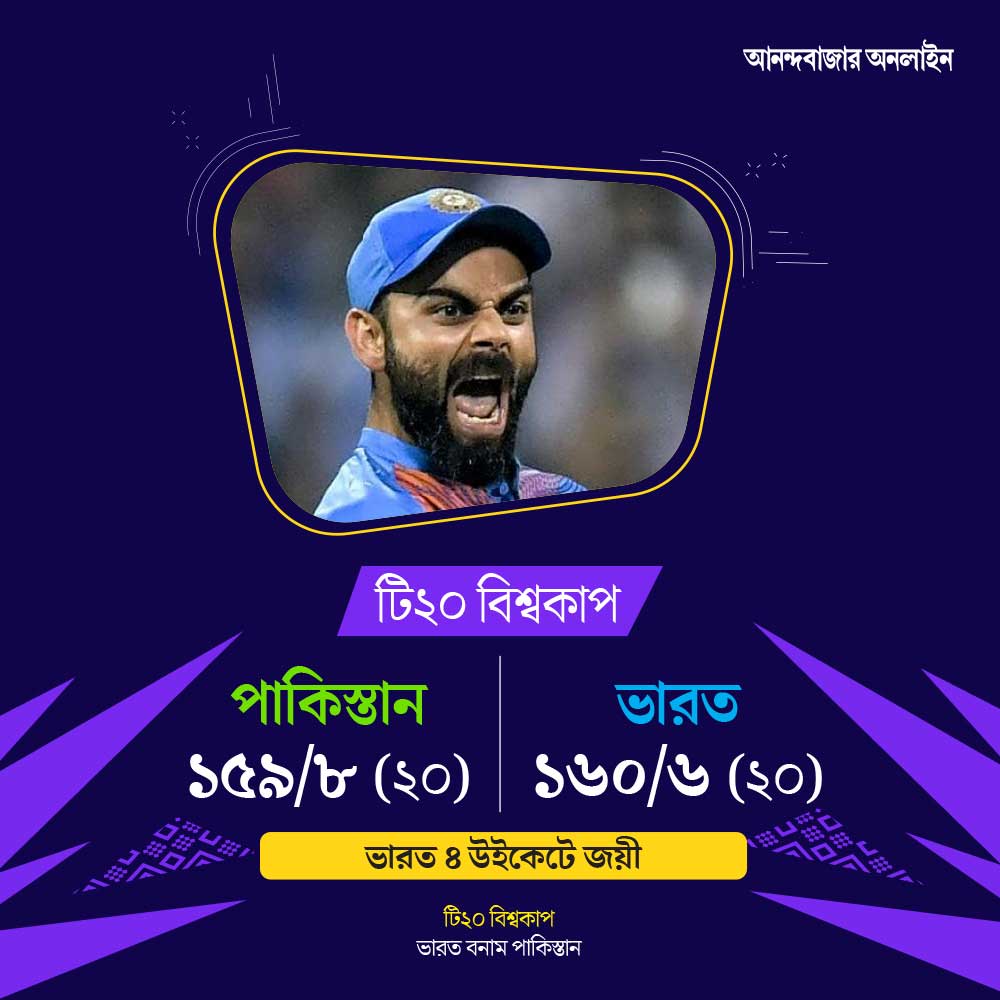 রবিবার টি-টোয়েন্টি বিশ্বকাপের ম্যাচে ভারত ৪ উইকেটে হারিয়ে দিল পাকিস্তানকে। প্রথমে ব্যাট করে ১৫৯ রান তোলে পাকিস্তান। শেষ বলে এসে সেই রান তুলে ম্যাচ জিতল ভারত। বিরাট ছাড়াও রান পেয়েছেন হার্দিক। তিনি ৩৭ বলে ৪০ রান করেন।