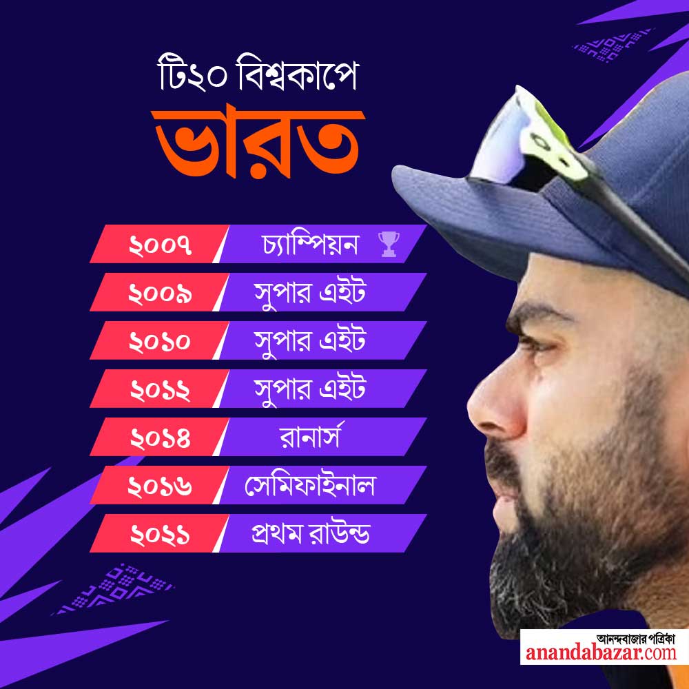 এ বারের টি-টোয়েন্টি বিশ্বকাপের শেষ চারে উঠতে পারল না বিরাট কোহলীর ভারত। টি-টোয়েন্টি বিশ্বকাপে এটিই ভারতের সব থেকে খারাপ পারফরম্যান্স। এর আগে কখনও গ্রুপ পর্ব থেকে বিদায় নিতে হয়নি ভারতকে।