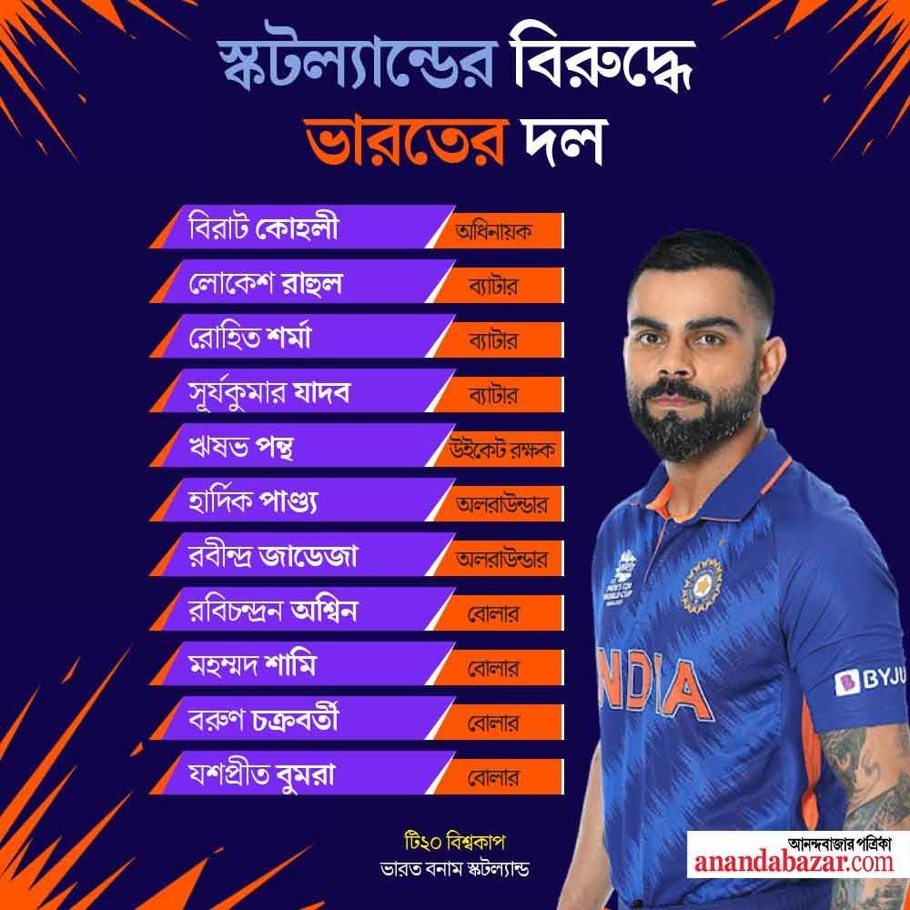 সেমিফাইনালে যাওয়ার জন্য এখন শুধু জয় নয়, বিরাট ব্যবধানে জয় প্রয়োজন ভারতের। টসে সেই কথাই মনে করিয়ে দিলেন অধিনায়ক বিরাট কোহলী। স্কটল্যান্ডকে কম রানে আটকে রেখে বিরাট জয় চাইছে ভারত।