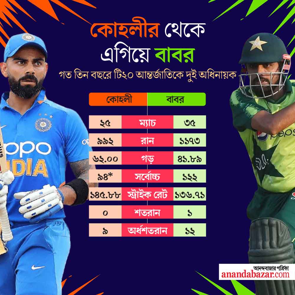 বিশ্বকাপে ভারত সব সময়ই এগিয়ে পাকিস্তানের থেকে। টি২০ বিশ্বকাপে পাঁচ বার মুখোমুখি হয়ে এক বারও ভারতকে হারাতে পারেনি পাকিস্তান। তবে শেষ তিন বছরে বাবর আজম বনাম বিরাট কোহলীর লড়াইয়ে টি২০ ক্রিকেটে এগিয়ে রয়েছেন পাকিস্তানের অধিনায়কই।