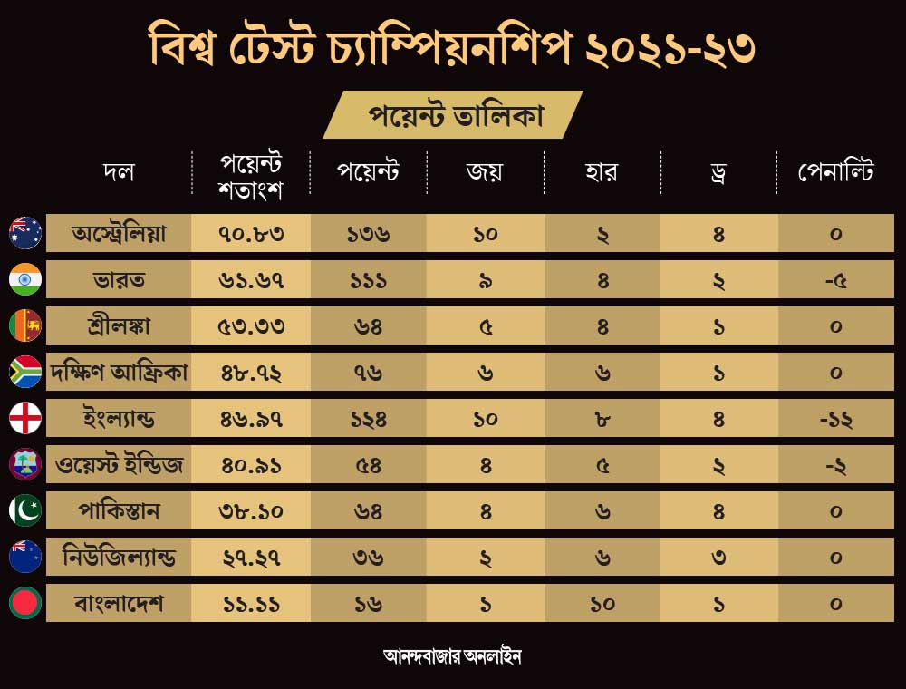 দক্ষিণ আফ্রিকার এখনও দু’টি টেস্ট বাকি। ওয়েস্ট ইন্ডিজের বিরুদ্ধে খেলবে তারা। সেই দু’টি টেস্টে দক্ষিণ আফ্রিকা জিতলে তাদের হবে ৫৫.৫৫ শতাংশ পয়েন্ট। অর্থাৎ অস্ট্রেলিয়া বা শ্রীলঙ্কার পয়েন্ট শতাংশকে টপকানো তাদের পক্ষে সম্ভব নয়। তাই লড়াই এখনও তিন দেশের মধ্যেই। তবে শ্রীলঙ্কার পক্ষে নিউ জ়িল্যান্ডের মাটিতে টেস্ট জেতা বেশ কঠিন। তাই বিশ্ব টেস্ট চ্যাম্পিয়নশিপ ফাইনালে ভারত বনাম অস্ট্রেলিয়া দেখা যেতে পারে বলে মনে করা হচ্ছে।