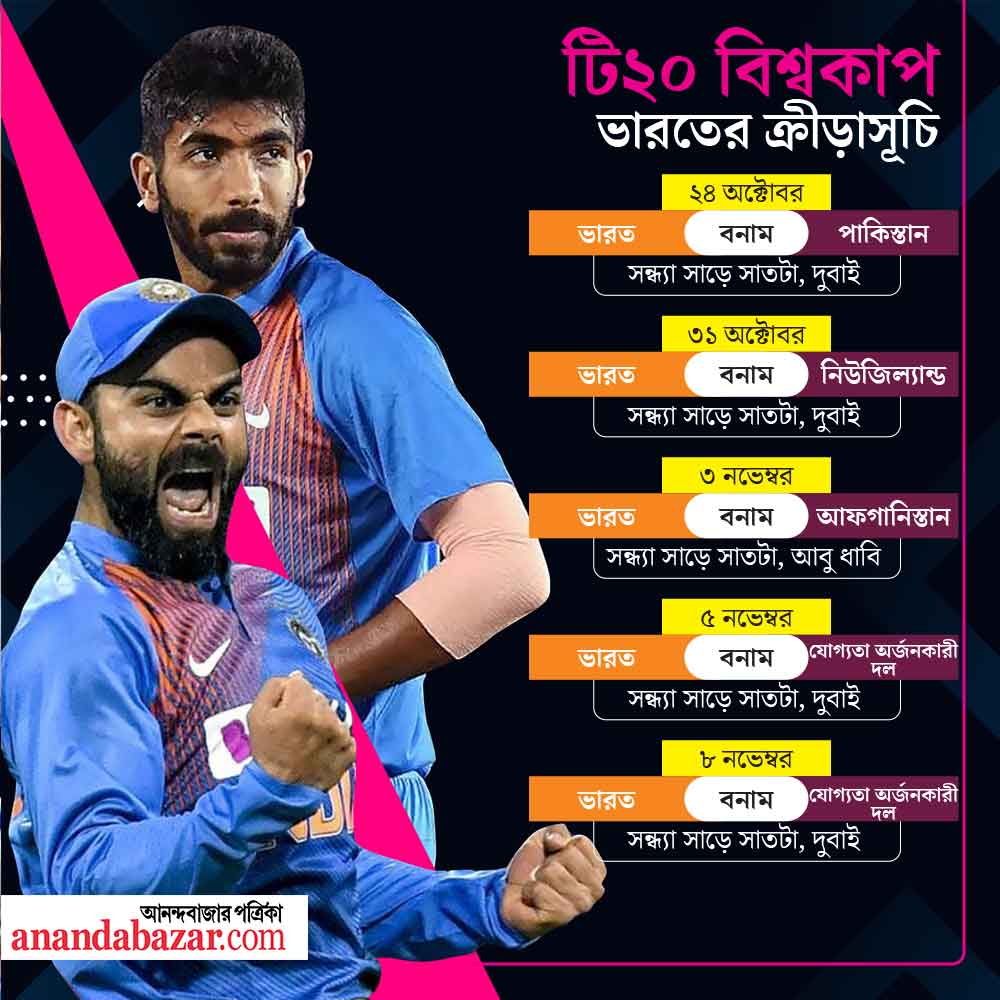 ২৩ অক্টোবর প্রথম ম্যাচে অস্ট্রেলিয়ার মুখোমুখি হবে দক্ষিণ আফ্রিকা। একই দিনে ইংল্যান্ডের বিরুদ্ধে খেলতে নামবে চ্যাম্পিয়ন ওয়েস্ট ইন্ডিজ। এর পরের দিনই ভারত-পাকিস্তান দ্বৈরথ। ৩১ অক্টোবর নিউজিল্যান্ডের বিরুদ্ধে দ্বিতীয় ম্যাচে খেলবে ভারত। তাদের পরের ম্যাচ ৩ নভেম্বর আফগানিস্তানের বিরুদ্ধে।