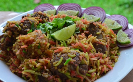 ২২৫ গ্রাম লম্বা দানা র চাল ৫০০ গ্রাম চর্বি বাদ দেওয়া কচি পাঁঠা র মাংস (বড় করে কাটা টুকরো) ২ বড় চামচ গোলমরিচ গুঁড়ো স্বাদ মতো নুন