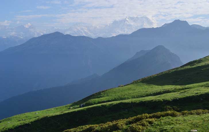 যেখানটায় বসে আছি, সামনে পাহাড়ের ঢাল বেয়ে নেমে গিয়েছে সবুজ মাঠ। দূরে ও পাশে দেখা যাচ্ছে বরফে মোড়া চৌখাম্বা, নন্দাদেবী, ত্রিশূল আর কেদারডোম। আরও কিছুটা দূরে অন্য পাহাড়ের গায়ে পাইন আর রডডেনড্রনের জঙ্গল। এখানে তো ঘণ্টার পর ঘণ্টা বসে থাকতে হয়...