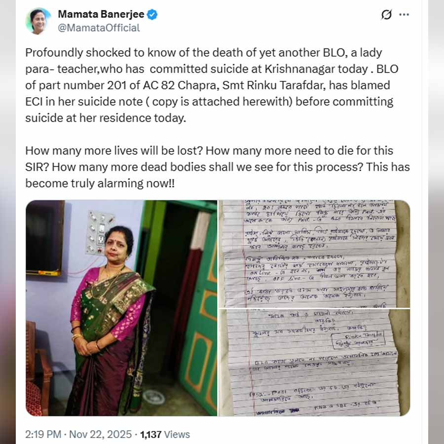 কেন আত্মহত্যার পথ বেছে নিচ্ছেন, তার ব্যাখ্যা দিয়ে সুইসাইড নোটে রিঙ্কু লিখেছেন, “অফলাইনের ৯৫ শতাংশ কাজ সেরে ফেলেছি, কিন্তু অনলাইনের কাজ আমি কিছুই জানি না। সুপারভাইজ়রকে জানিয়েও কোনও লাভ হয়নি।” তার পরই লেখা রয়েছে, “বিএলও কাজ তুলতে না-পারলে প্রশাসনিক চাপ এলে তা আমার পক্ষে নেওয়া সম্ভব নয়।” মৃতার স্বামী অসীম তরফদার বলেন, “ফর্ম বিলি সঠিক সময়ে করেছে। কিন্তু ডিজিটাল আপলোডের ব্যাপারে কিছু জানত না। বার বার জানিয়েও কোনও সুরাহা হয়নি। এটা আত্মহত্যা নয়, কমিশনের দ্বারা হত্যা।”