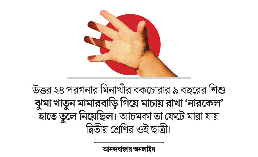 এর মধ্যেই দক্ষিণ ২৪ পরগনার কুলপি থানার দক্ষিণ গাজিপুর পঞ্চায়েতের ছামনাবুনির দুই কিশোর তৌহিদুল পাইক এবং ফরিদুল পাইক জখম হয়েছে কালভার্টের নীচে পড়ে থাকা বোমাকে বল ভেবে খেলতে গিয়ে। উত্তর ২৪ পরগনার মিনাখাঁর বকচোরার ৯ বছরের শিশু ঝুমা খাতুন মামারবাড়ি গিয়ে মাচায় রাখা ‘নারকেল’ হাতে তুলে নিয়েছিল। আচমকা তা ফেটে মারা যায় দ্বিতীয় শ্রেণির ওই ছাত্রী। ঝুমার মামা আবু হোসেন গাইন এলাকায় ‘তৃণমূলের লোক’ হিসাবেই পরিচিত। যদিও আবুর তৃণমূল যোগের কথা অস্বীকার করেছেন জেলার জোড়াফুল শিবিরের নেতারা।