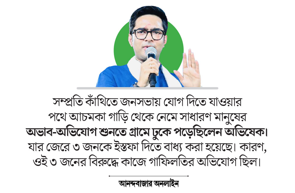 পঞ্চায়েতে ‘দুর্নীতি’র অভিযোগ খতিয়ে দেখতে তিনটি স্তরে সদস্যদের কাজের সমস্ত খতিয়ান নিতে চাইছেন তৃণমূল নেতৃত্ব। সম্প্রতি কাঁথিতে জনসভায় যোগ দিতে যাওয়ার পথে আচমকা গাড়ি থেকে নেমে সাধারণ মানুষের অভাব-অভিযোগ শুনতে গ্রামে ঢুকে পড়েছিলেন অভিষেক। যার জেরে তিন জনকে ইস্তফা দিতে বাধ্য করা হয়েছে। কারণ, ওই তিন জনের বিরুদ্ধে কাজে গাফিলতির অভিযোগ ছিল। আবার মমতা গ্রামে গ্রামে ঢুকে পড়ছেন ‘ঘরের মেয়ে’ হয়ে। কোথাও মাছের ঝোল-ভাত খাচ্ছেন, কোথাও চপ বিলি করছেন।