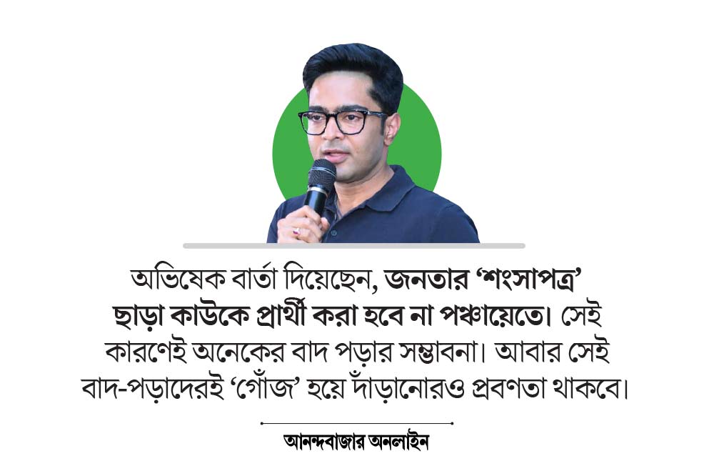 জনপ্রিয় ধারণা হল, পঞ্চায়েতে আসনবৃদ্ধি শাসকদলের পক্ষে ‘স্বস্তির’। তাতে আসন নিয়ে দলীয় নেতা-কর্মীদের মধ্যে কাড়াকাড়ি কমবে। পঞ্চায়েতের মতো স্থানীয় স্তরে ‘গোঁজ’ প্রার্থী দেওয়ার প্রবণতা প্রবল। অভিষেক বার্তা দিয়েছেন, জনতার ‘শংসাপত্র’ ছাড়া কাউকে প্রার্থী করা হবে না পঞ্চায়েতে। সেই কারণেই অনেকের বাদ পড়ার সম্ভাবনা। আবার সেই বাদ-পড়াদেরই ‘গোঁজ’ হয়ে দাঁড়ানোরও প্রবণতা থাকবে।