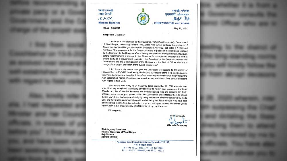 আগামী বৃহস্পতিবার কেন্দ্রীয় বাহিনীর কপ্টারে চড়ে ভোট পরবর্তী হিংসা দেখতে যাবেন রাজ্যপাল জগদীপ ধনখড়। তাঁর সফরের তালিকায় রয়েছে শীতলখুচি-সহ কোচবিহার জেলার বিভিন্ন স্থান। মঙ্গলবার রাজ্যপালের সরকারি টুইটারে এ কথা জানানো হয়েছিল। মমতা চিঠিতে লিখেছেন, রাজ্য স্বরাষ্ট্র দফতরের ১৯৯০ সালের ‘ম্যানুয়্যাল অফ প্রোটোকল অ্যান্ড সেরিমনিয়্যালস’-এর পরিপন্থী।